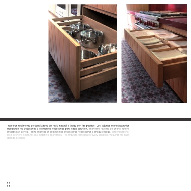 Interiores totalmente personalizados en roble natural a juego con las puertas. Los cajones manufacturados